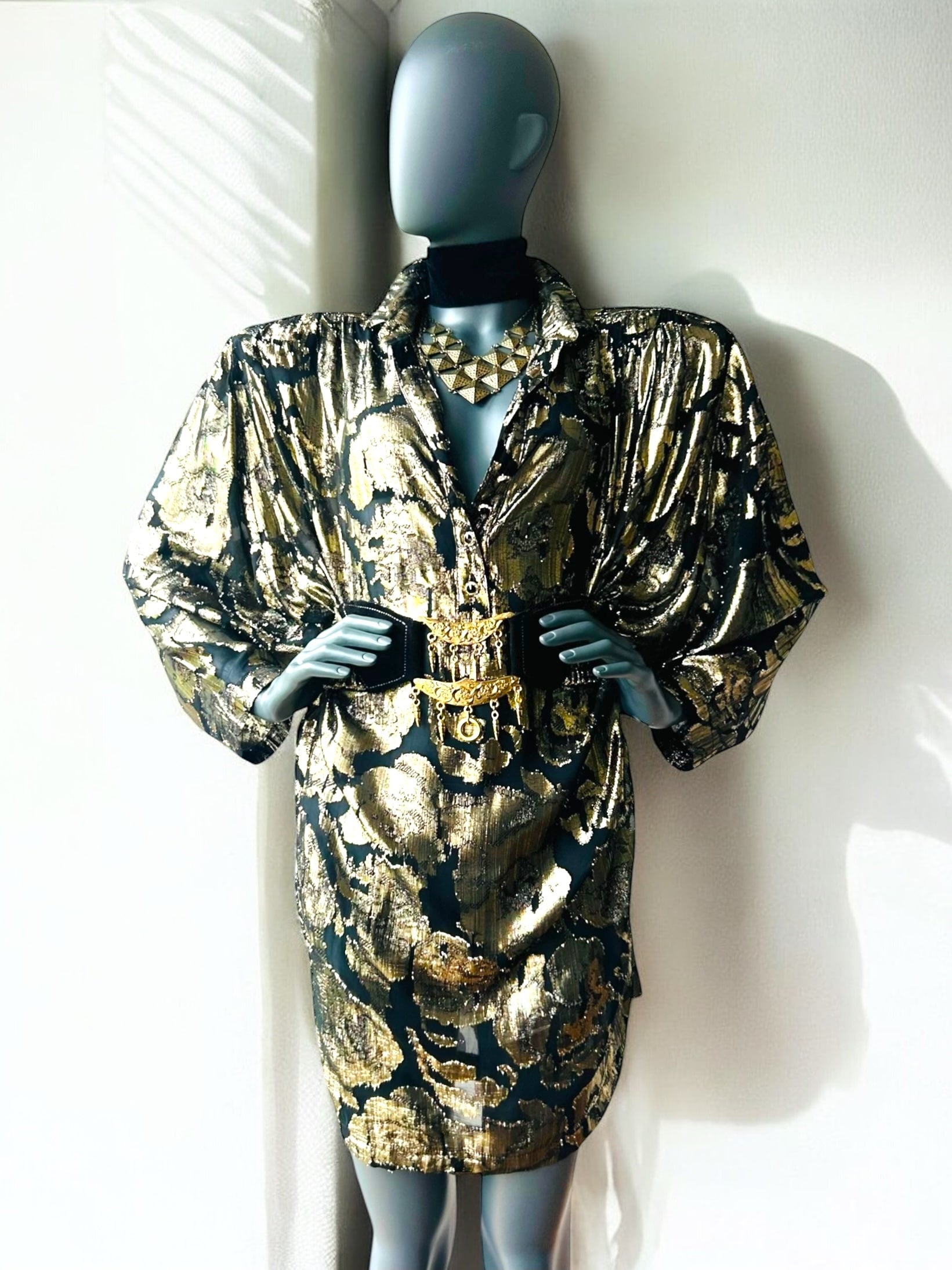 Vintage 1980s Gold and Black Lame Batwing Shirt Dress
