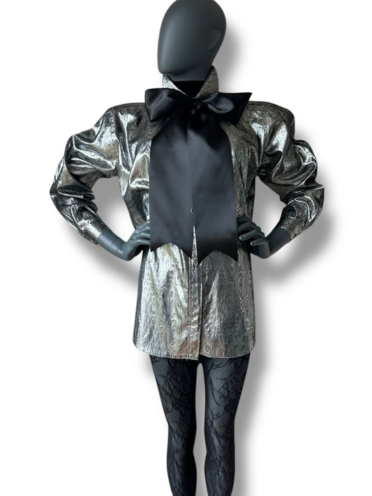 Vintage 1980s Silver Lamé Cocktail Shirt and Satin Bow