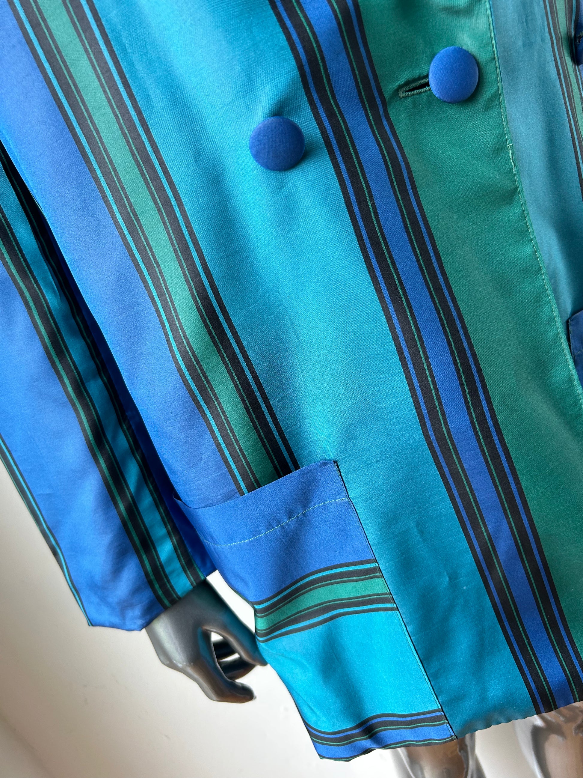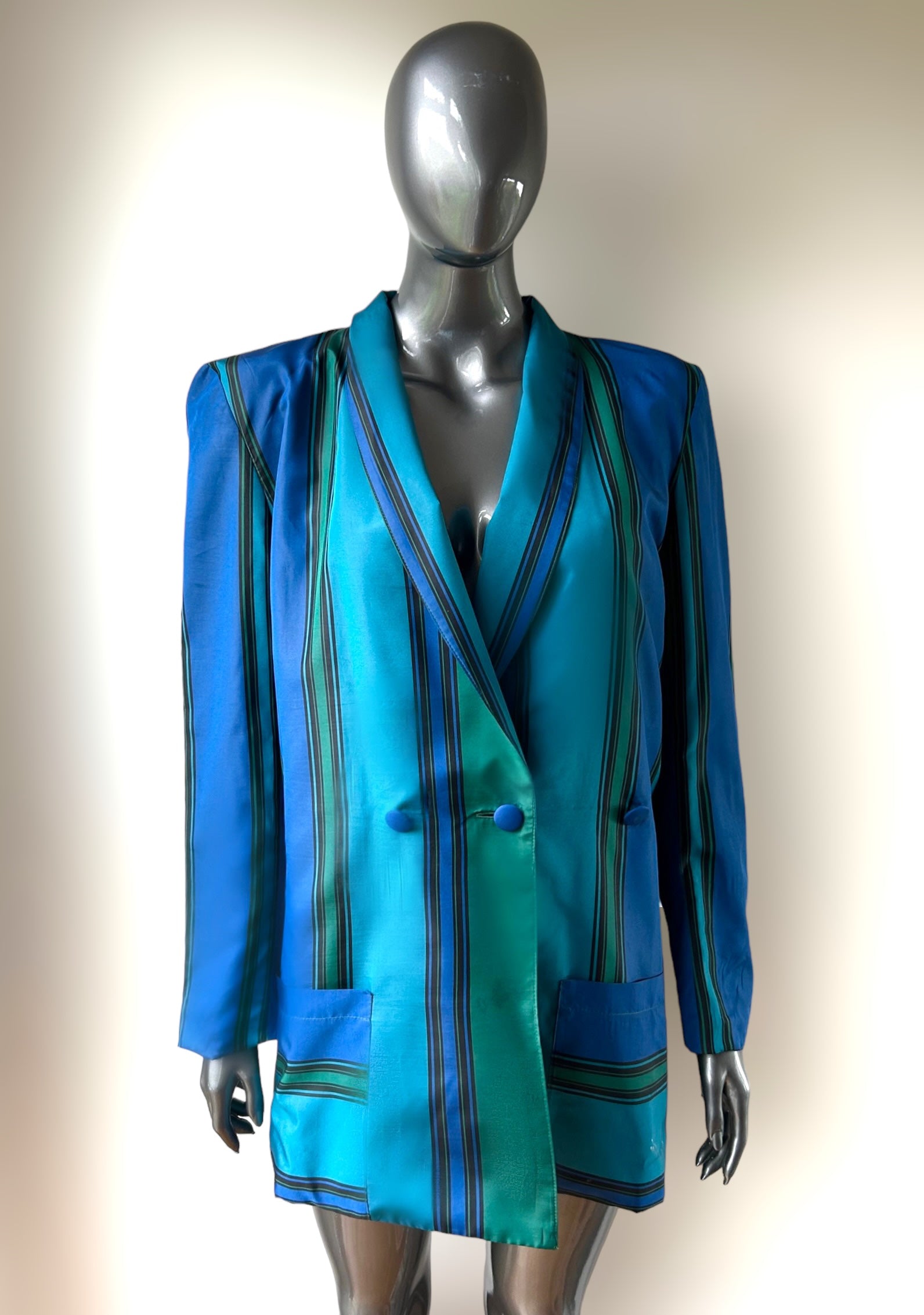 This unique and rare vintage 1980s Avant Garde Blazer is a statement piece you won't want to miss. Cut from a bright blue and green taffeta blend fabric, its bold double-breasted design is bolstered with two shoulder pads and deep pockets to give it an impressive and dramatic silhouette. A perfect example of the luxurious power dressing trend made famous by legendary designers such as Montana and Saint Laurent. It's a true one-of-a-kind piece that will be sure to draw attention and make a statement wherever you go.