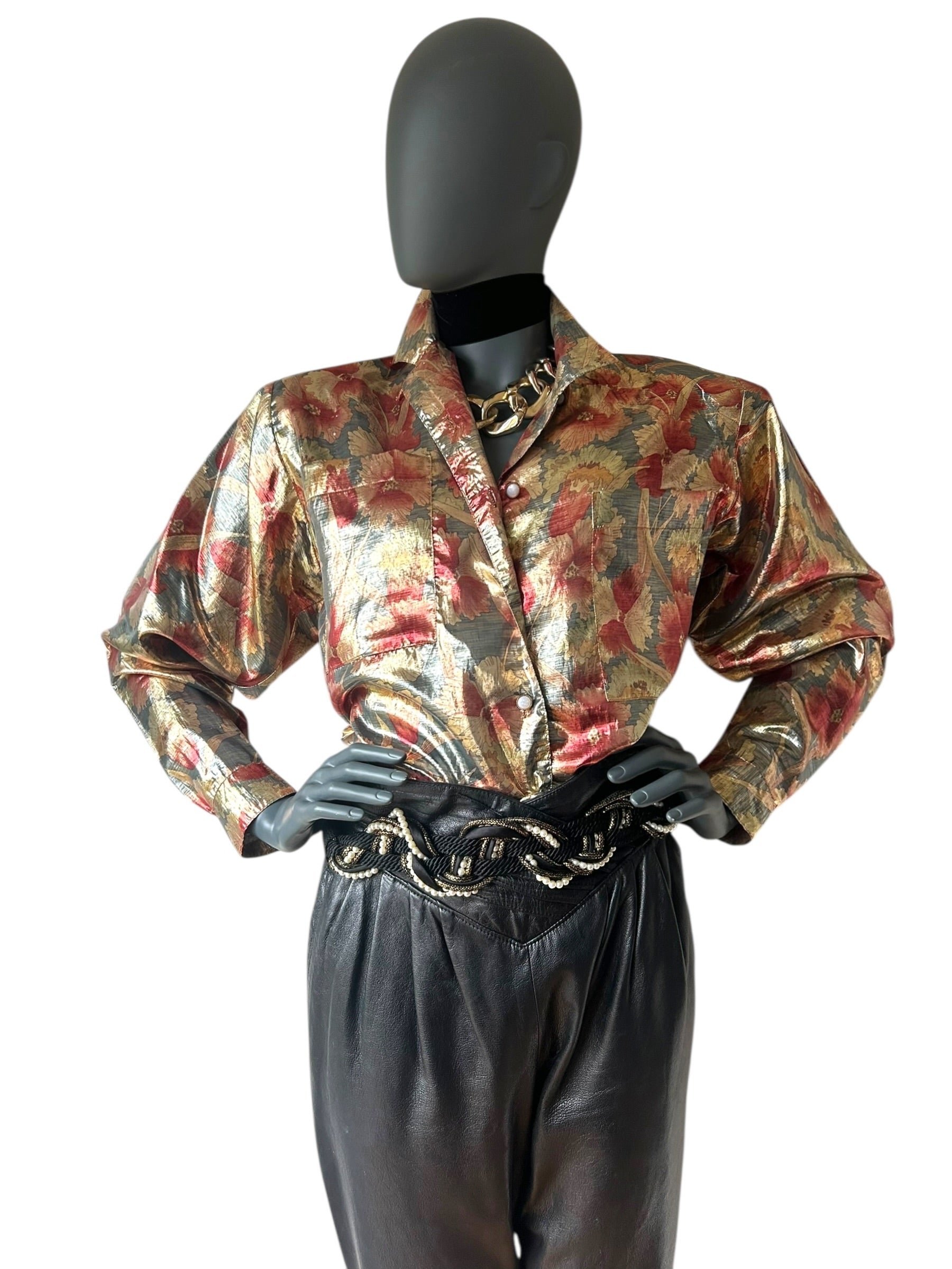 This striking late-1970s blouse is cut from metallic gold lamé, showcasing a rich woven floral design in deep red and muted green. The fabric catches the light with every movement, reflecting the era’s affinity for shimmer and drama in eveningwear. The silhouette is deliberately sharp, with a clean line through the body and gently gathered sleeves that add subtle volume at the shoulders without overwhelming the structure.