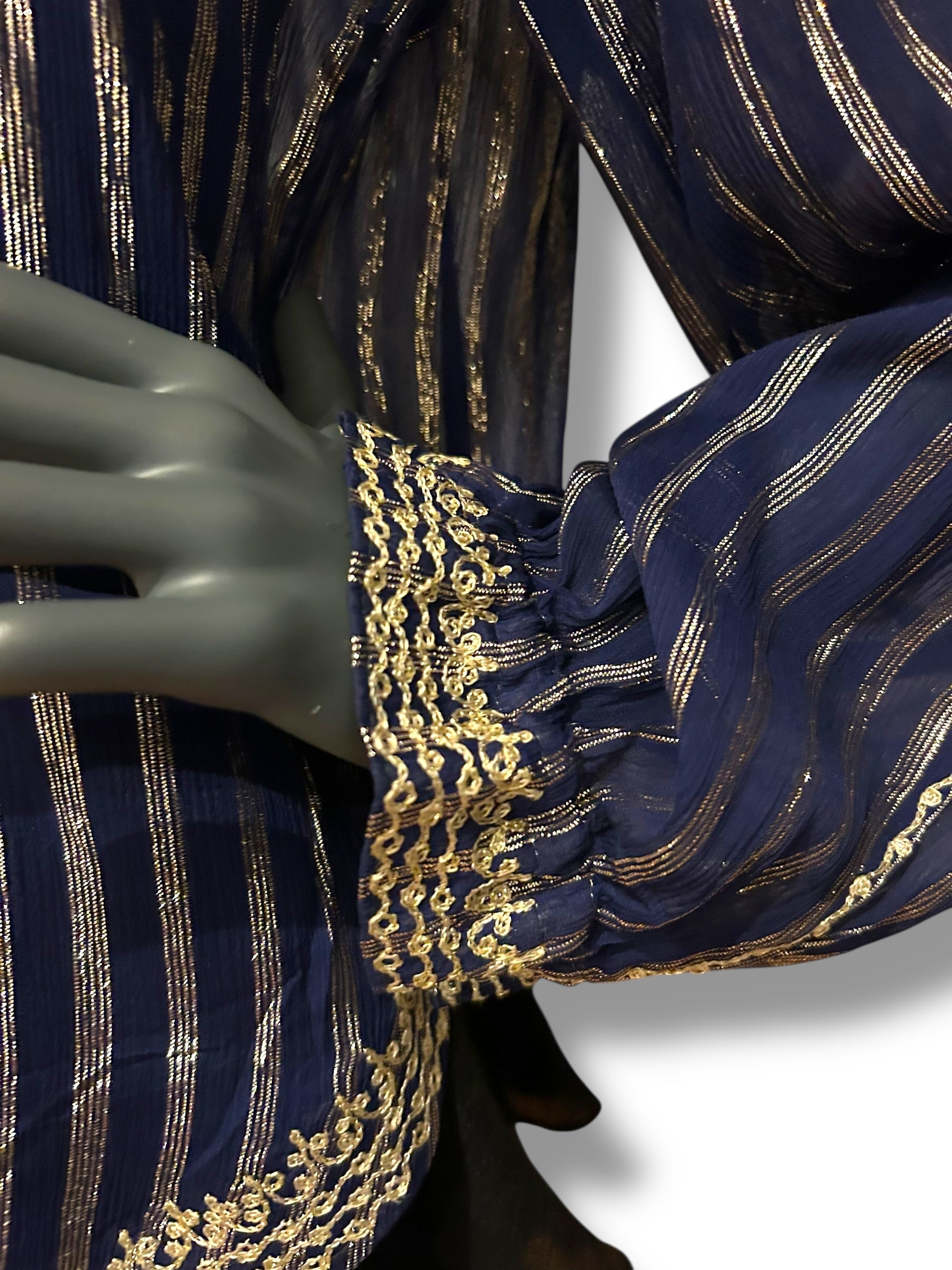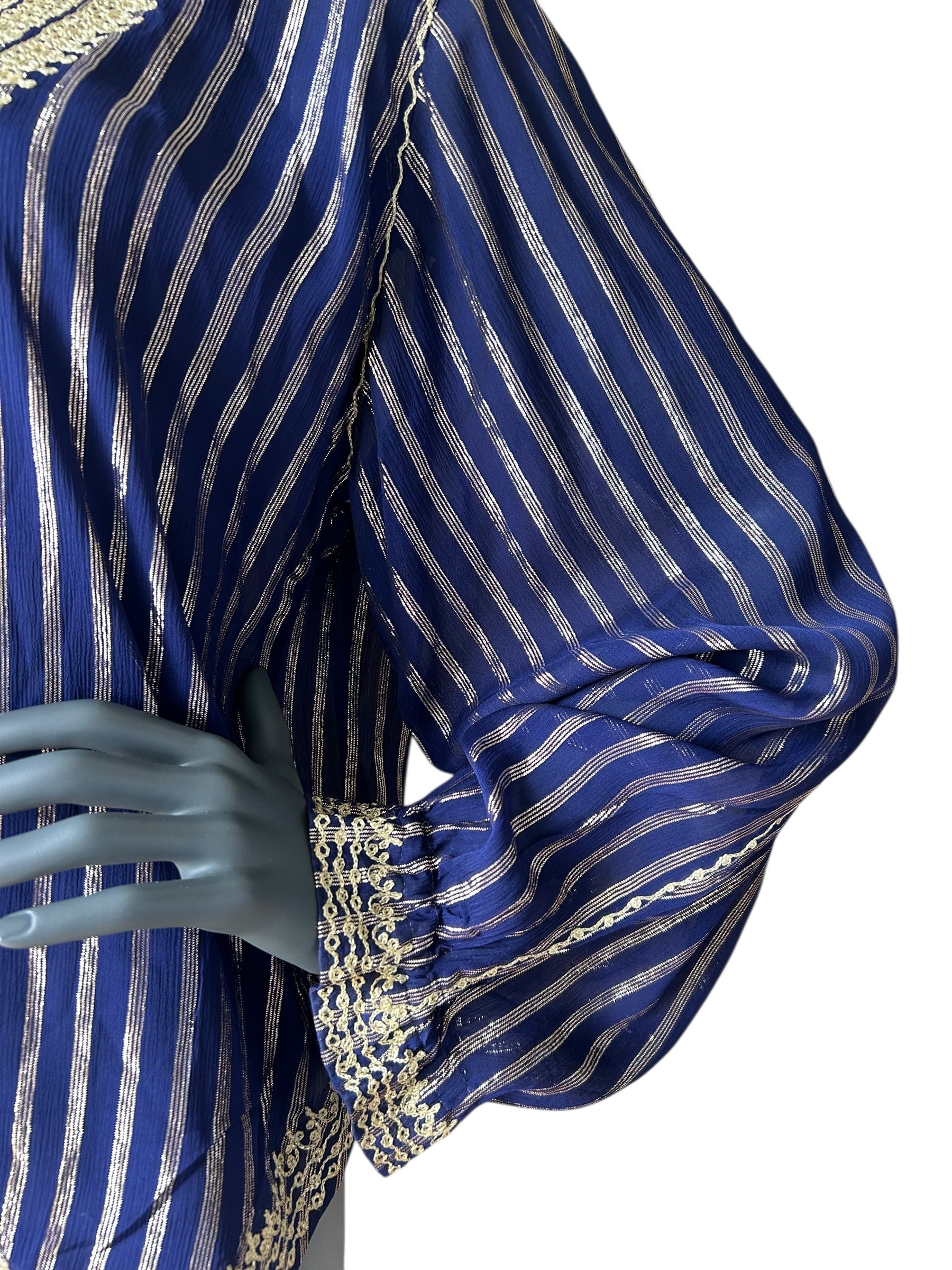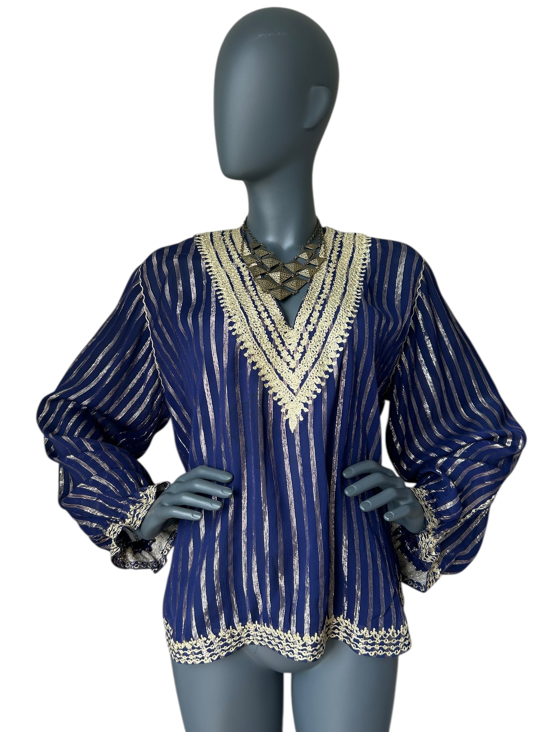 This original 1960s kaftan-style blouse draws influence from the North African-inspired silhouettes made popular in European fashion circles during the late 1960s, notably influenced of Y Saint Laurent’s Moroccan collections and are hard to come by. Constructed from a semi-sheer deep navy chiffon with vertical gold lamé striping, the blouse features an elaborately hand-embroidered neckline, hem, and cuffs in metallic gold thread. The fabric composition and finishing suggest a piece sourced or made for luxury export markets, possibly commissioned or custom-made through a boutique atelier.