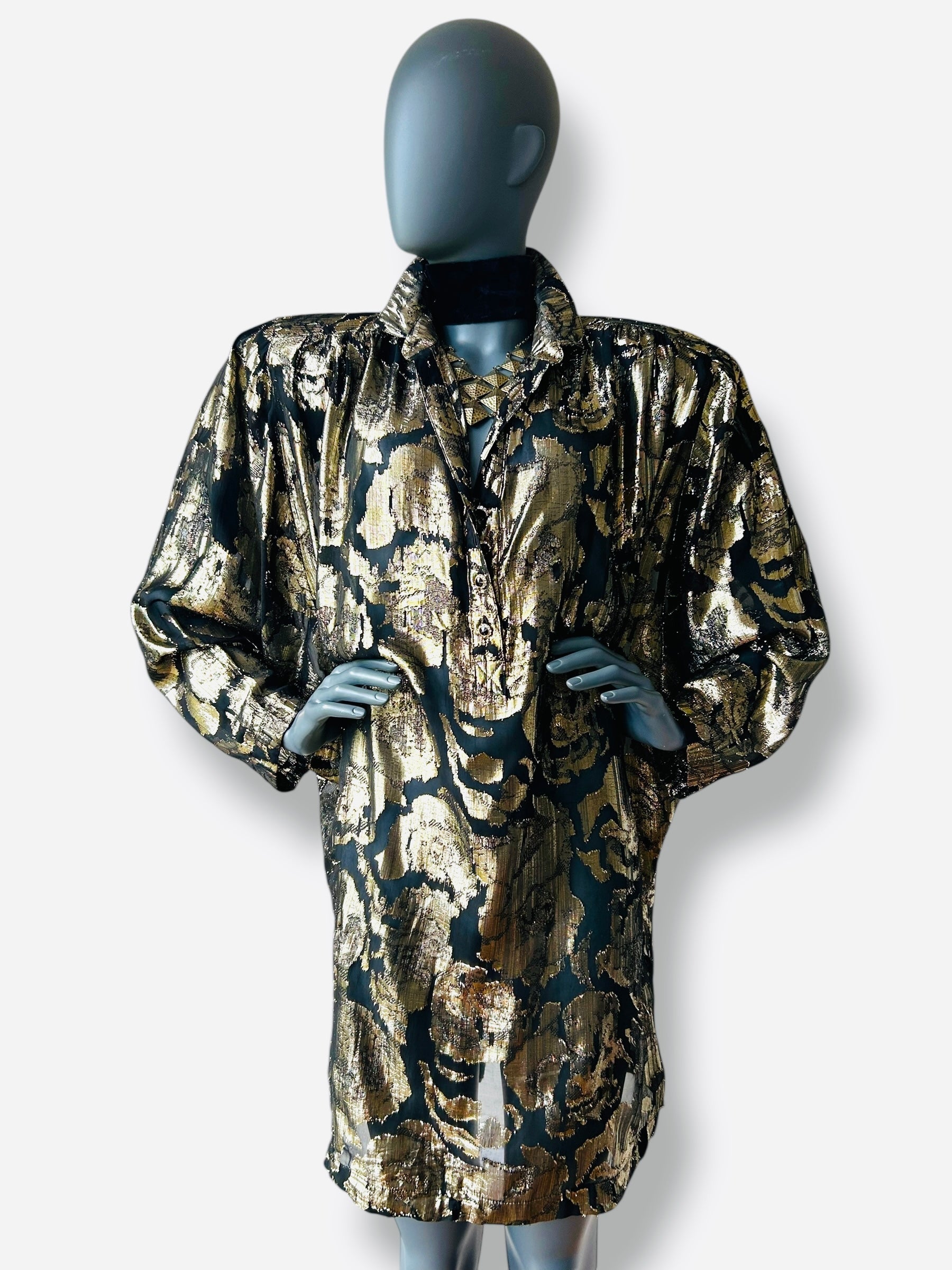 Vintage 1980s Gold and Black Lame Batwing Shirt Dress
