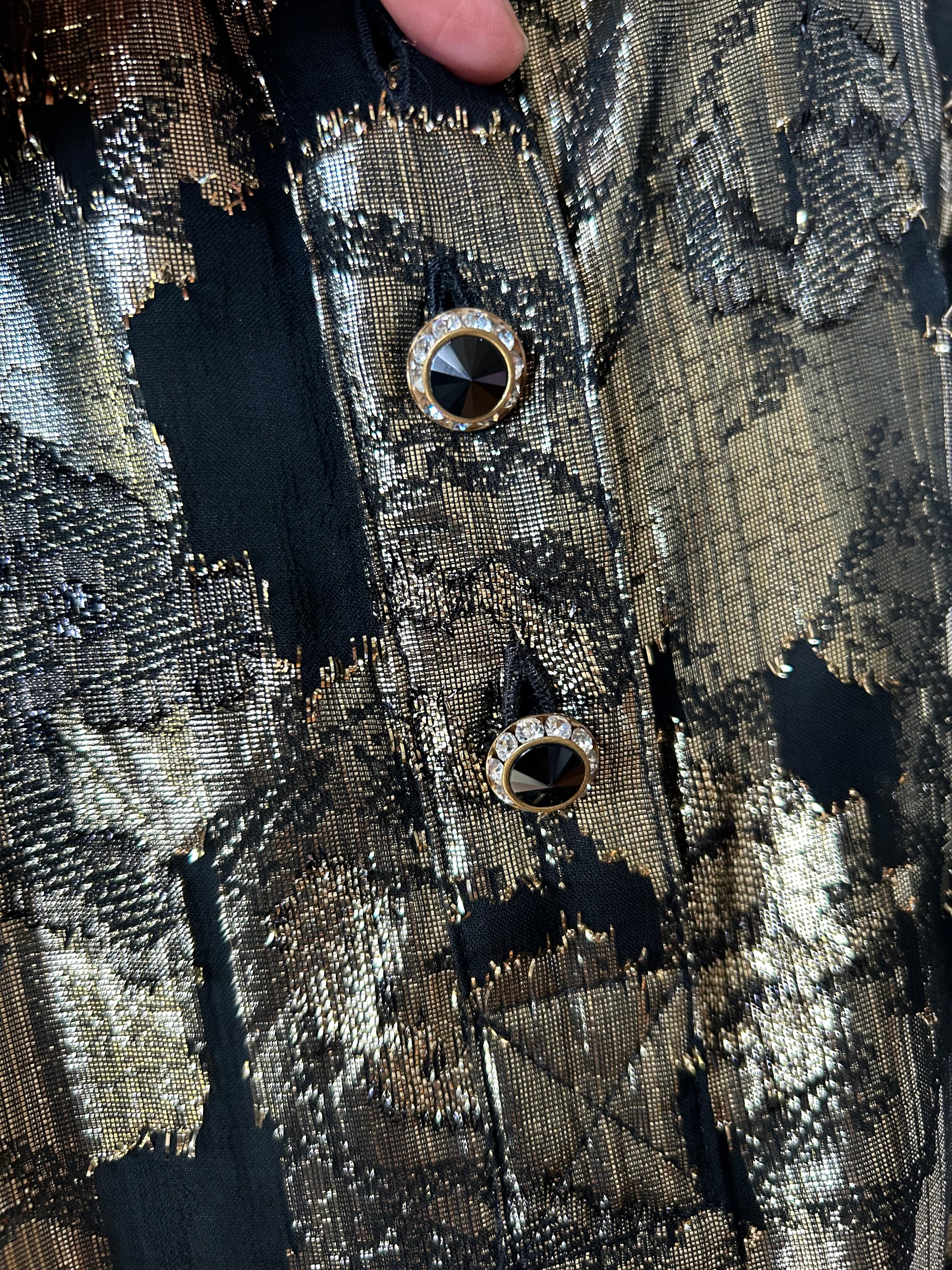 This striking piece from the 1980s showcases the decade’s bold approach to silhouette and surface design. Constructed from a sheer black base interwoven with metallic gold lamé in an abstract floral pattern, it offers a luminous, sculptural presence. The relaxed batwing (dolman) sleeve structure, combined with a tapered hemline, allows for fluid movement and a flattering drape across the shoulders and arms. Featuring a partial button placket adorned with faceted black and crystal-trimmed buttons, the design balances opulence with refined detailing. The lightweight, semi-transparent fabric gives versatility—ideal styled loose or cinched at the waist with a wide belt for definition.