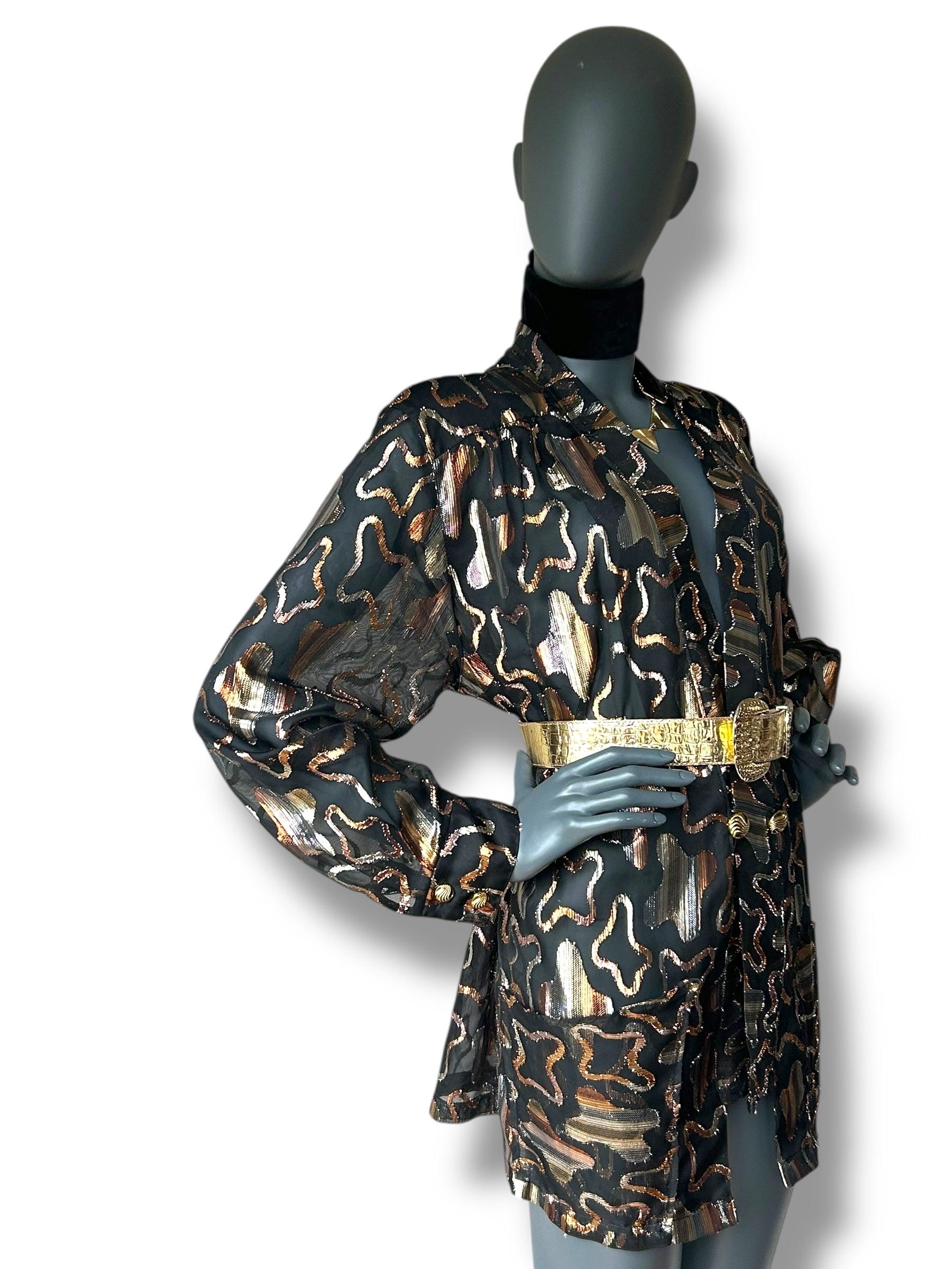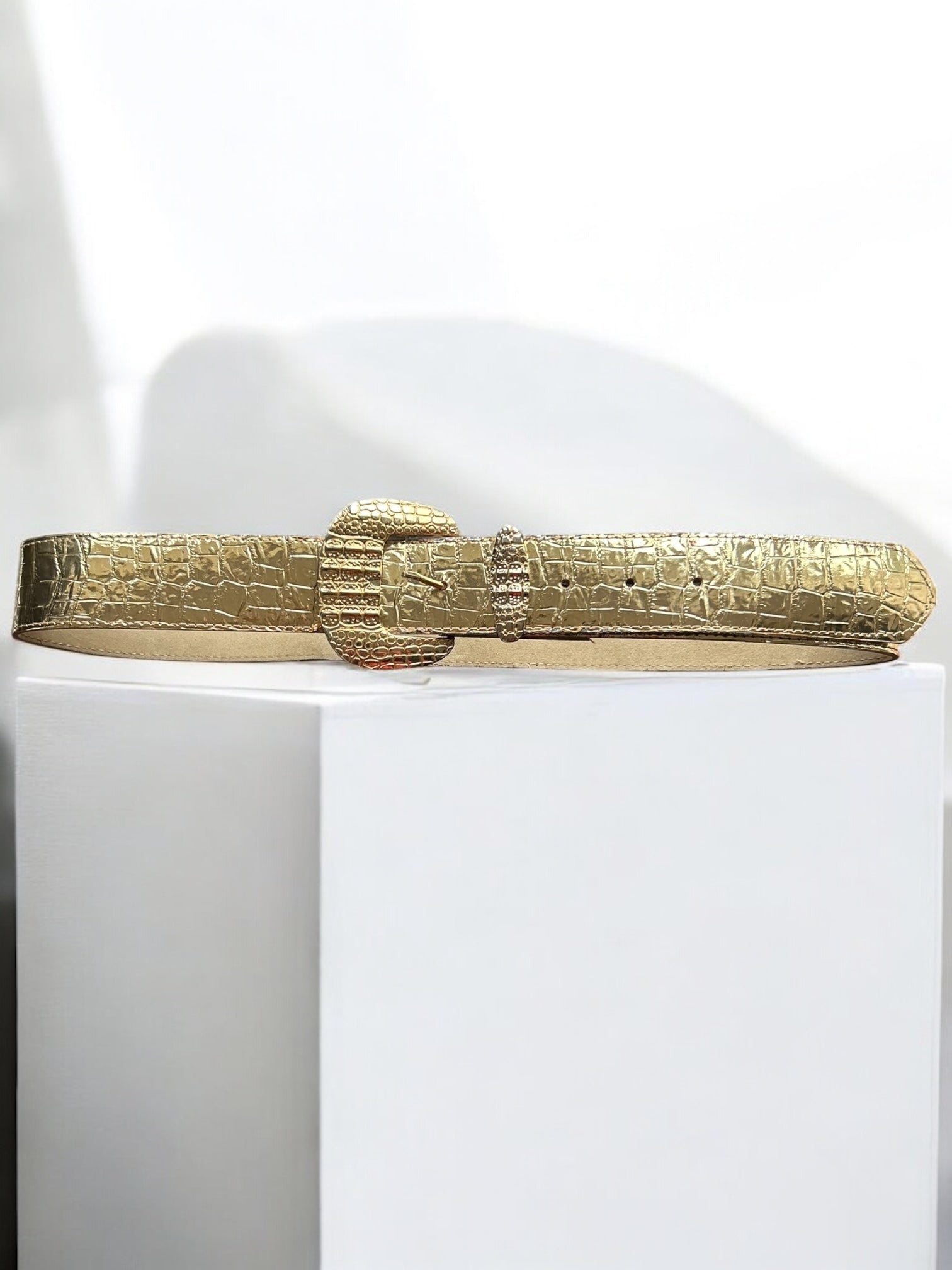 This statement belt originates from the early 1980s and showcases the decade’s fascination with bold metallic finishes and textural experimentation. Made from genuine leather embossed in a crocodile pattern, it is finished in a high-shine gold tone that reflects the luxurious sensibilities of the era. The oversized buckle, keeper, and tip feature intricate reptilian embossing, sculpted to enhance depth and structure. The belt’s broad width allows it to be worn both at the waist and on the hips, offering versatility in styling—perfect for cinching dresses, tailoring, or eveningwear.