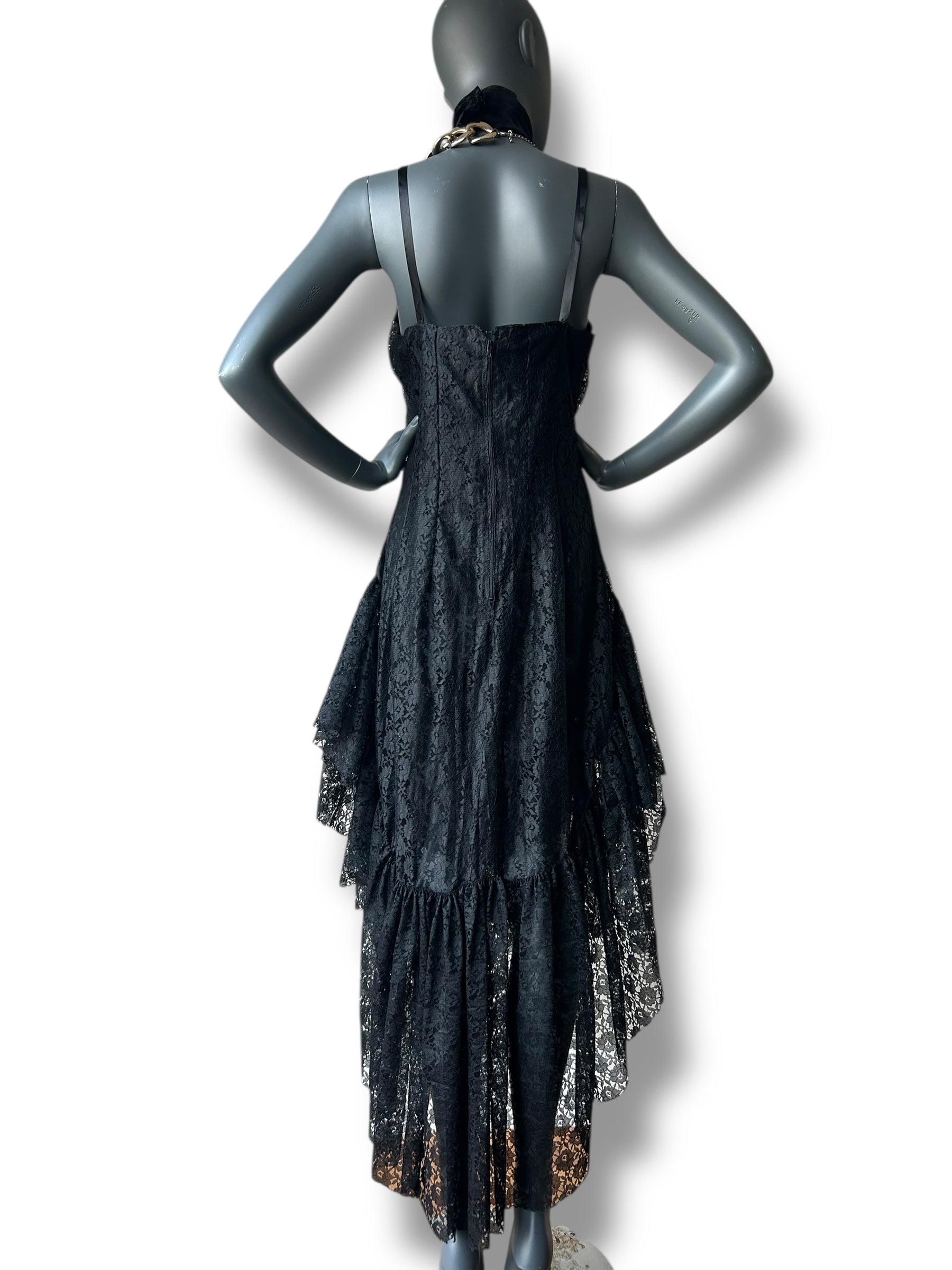 This original 1980s black lace dress features a striking handkerchief hem and layered godet-style panels that rise dramatically at the sides and descend in deep cascading folds at the back. The silhouette offers sculptural movement and architectural depth, with a hemline that showcases intricate floral lace in high contrast against light. Constructed with a fitted bodice and narrow satin straps, the design references late-decade eveningwear with its balance of delicacy and bold structure.