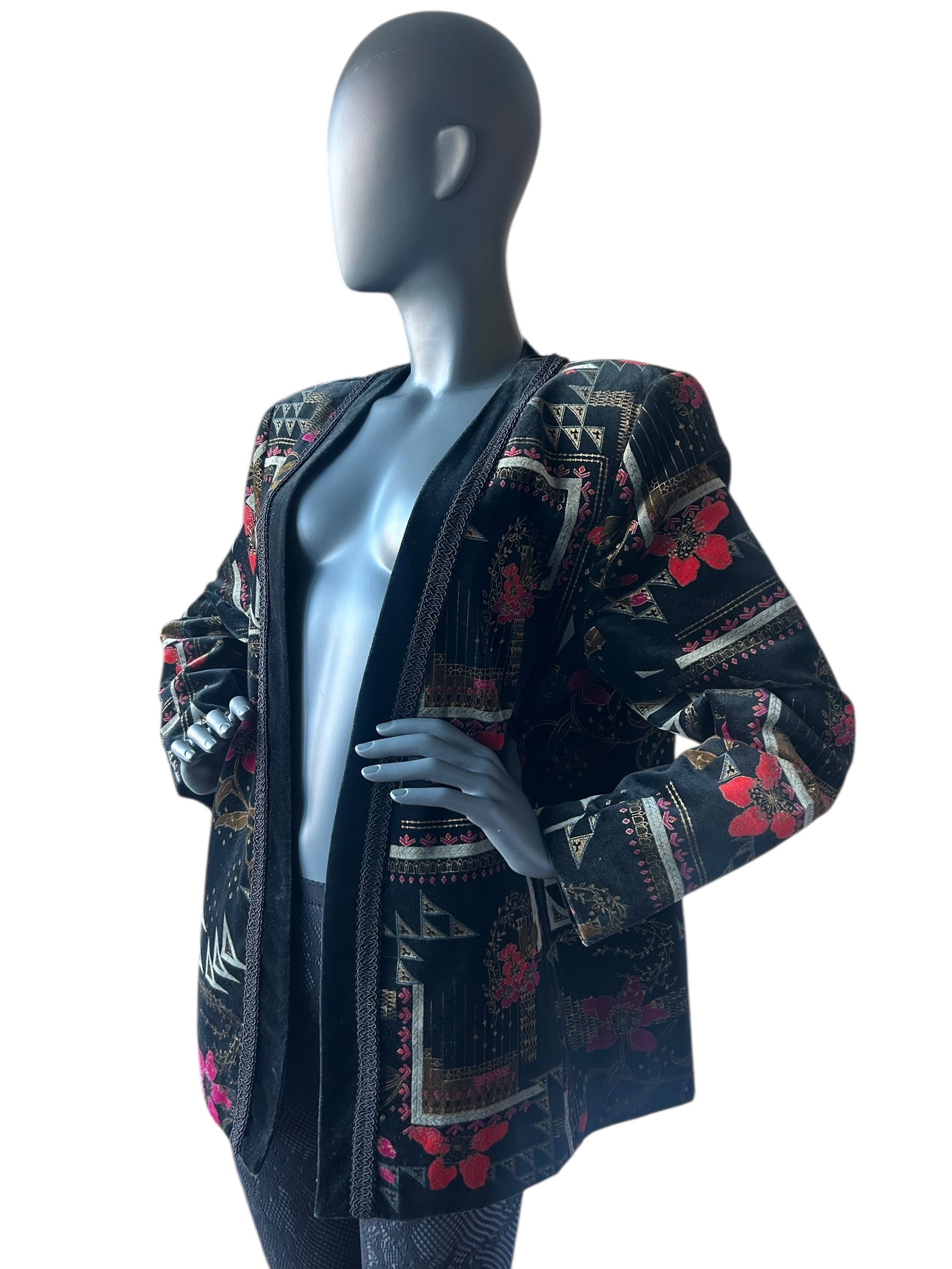 This exceptional piece from the late 1980s captures the exuberant artistry of the new wave era. Made from plush black velvet, the jacket features an intricate fusion of metallic gold geometric motifs and vivid floral arrangements in shades of red and fuchsia. The open-front design is finished with a black velvet trim and detailed braiding along the edge, lending structure and contrast to the ornate print.