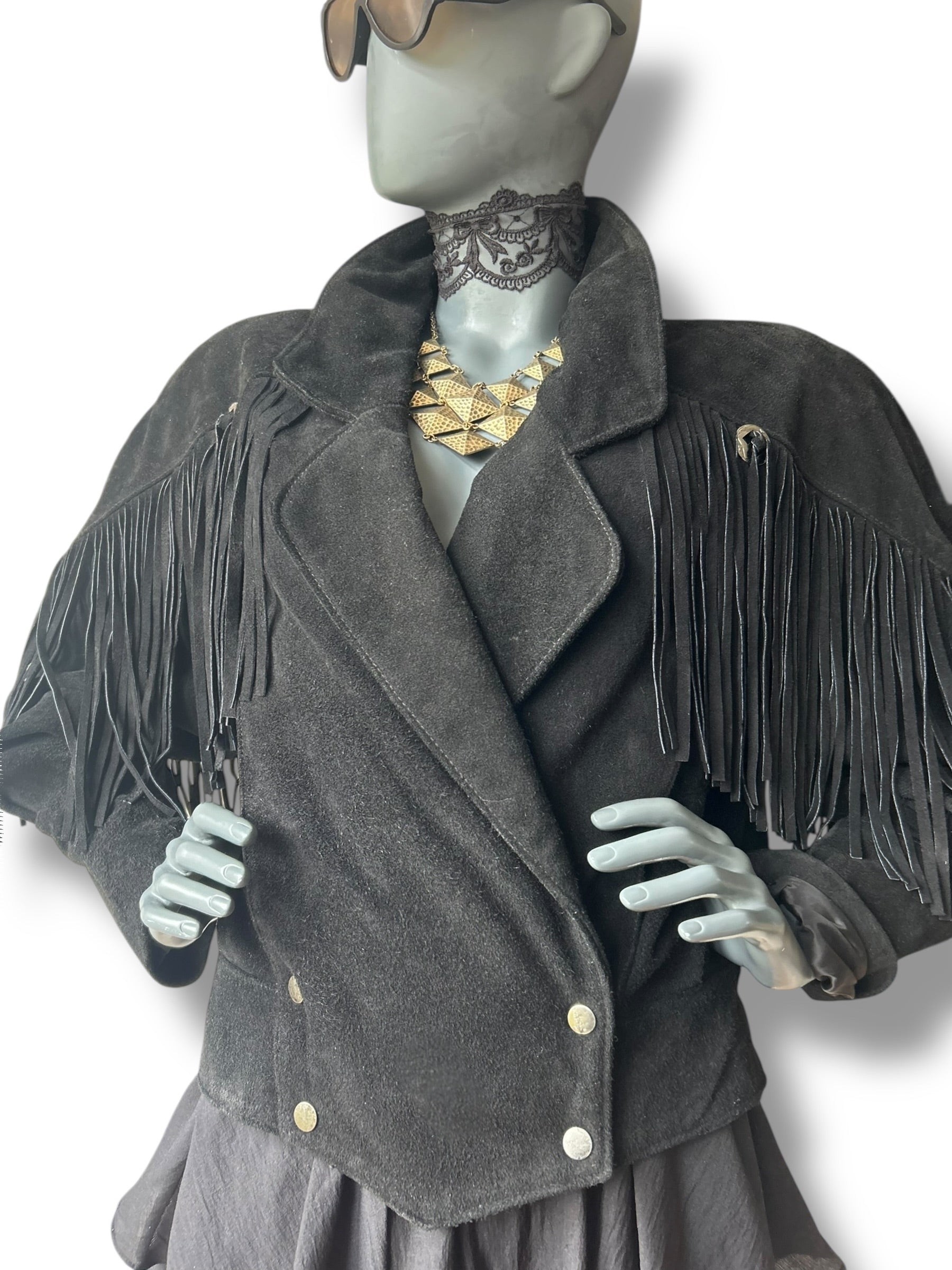 Introducing a complete one-of-a-kind, unique and 1980s black suede western fringe jacket with silver-tone hardware