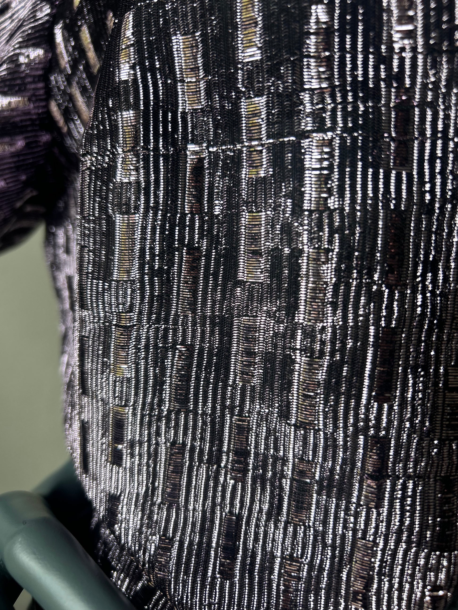 The lamé fabric captures the era’s fascination with light, movement, and modern glamour, reminiscent of Studio 54 styling yet softened by the artisanal, bohemian nature of its tailoring. Lightweight yet visually striking, this bolero transitions seamlessly across styling eras, lending itself equally to 1970s eveningwear, 1980s statement dressing, or more relaxed creative styling. Free size.