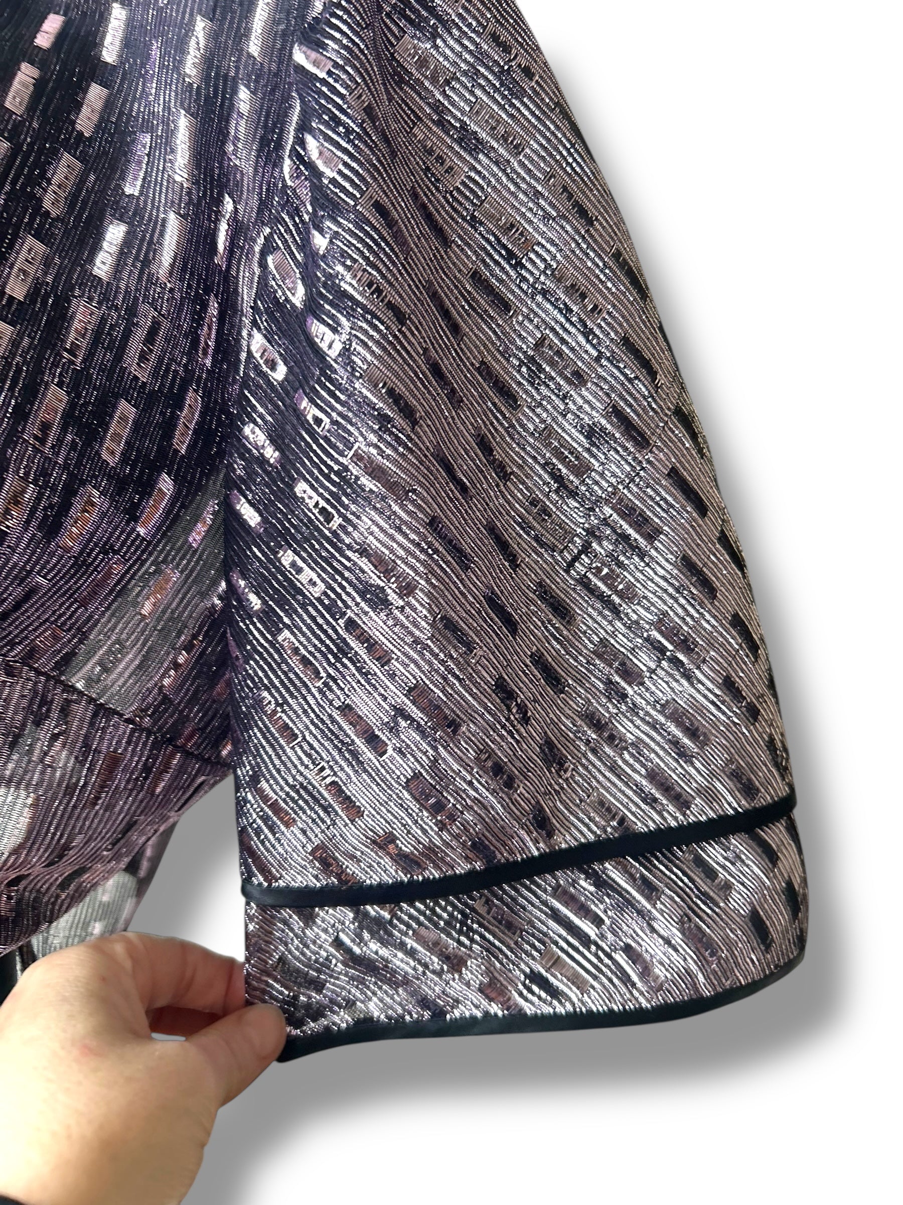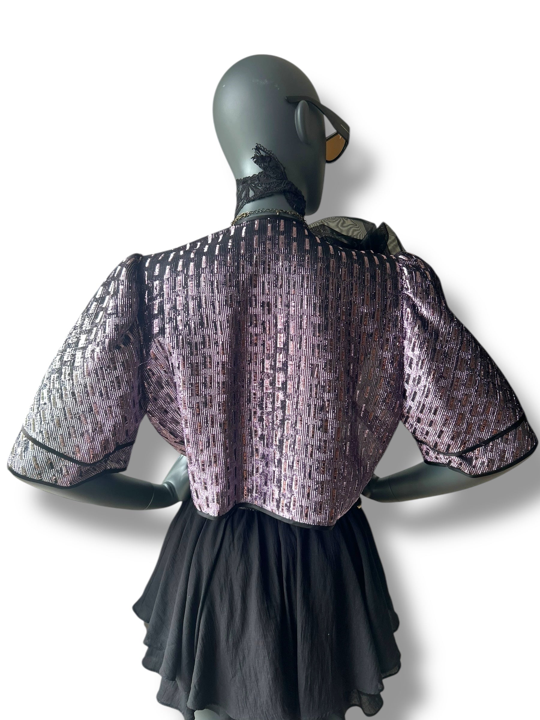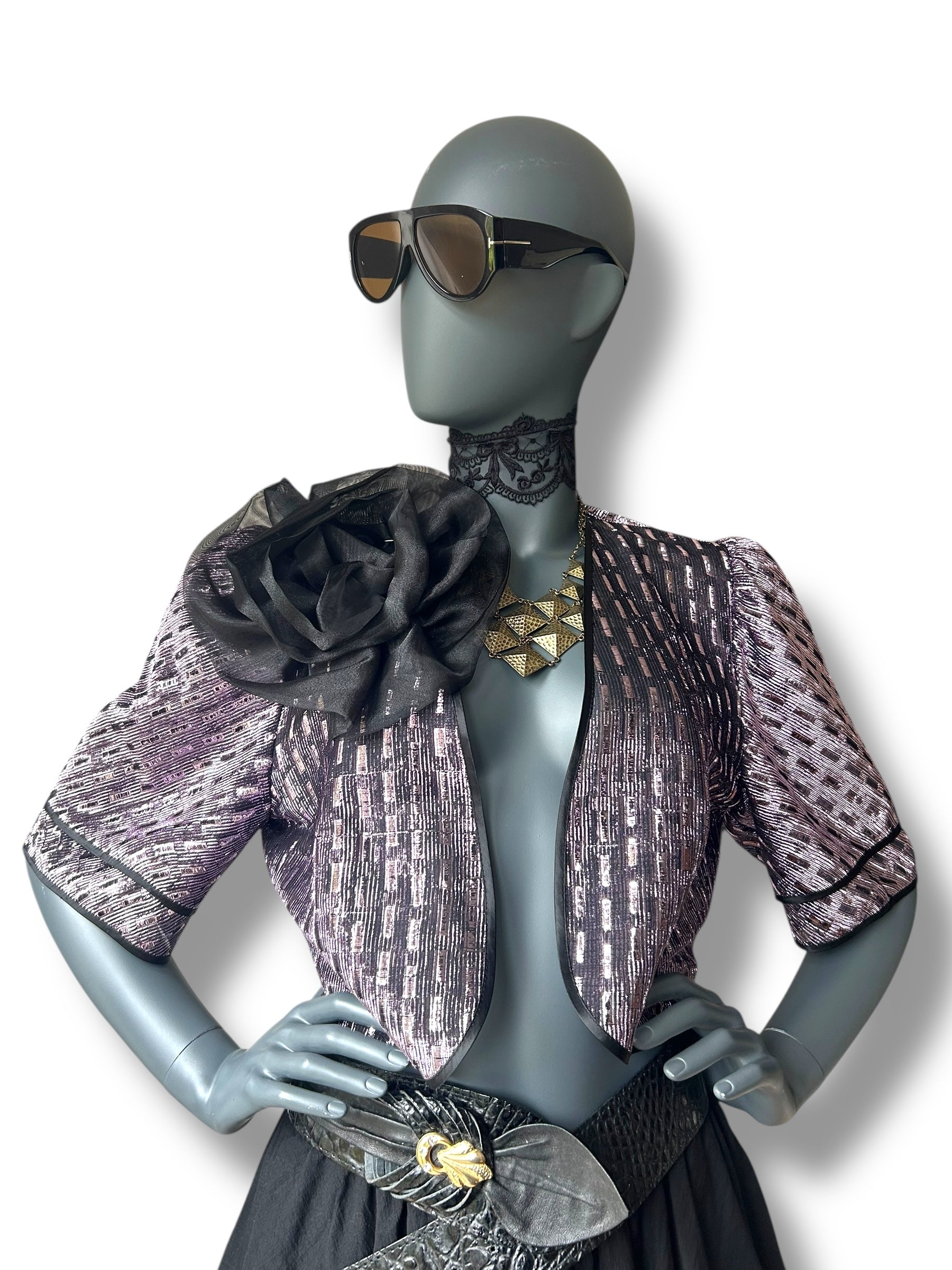 This exquisite 1970s bolero is fashioned from a metallic lamé knit in a lilac tone interwoven with black, creating a textured geometric surface that shimmers beautifully under light. The cropped silhouette features soft structure through its sculpted scalloped front edge, enhanced with black satin piping that continues to outline the sleeves and hem for definition. The double-layer bell sleeves add volume and architectural balance, while the oversized black organza bow at the shoulder provides a dramatic focal point.