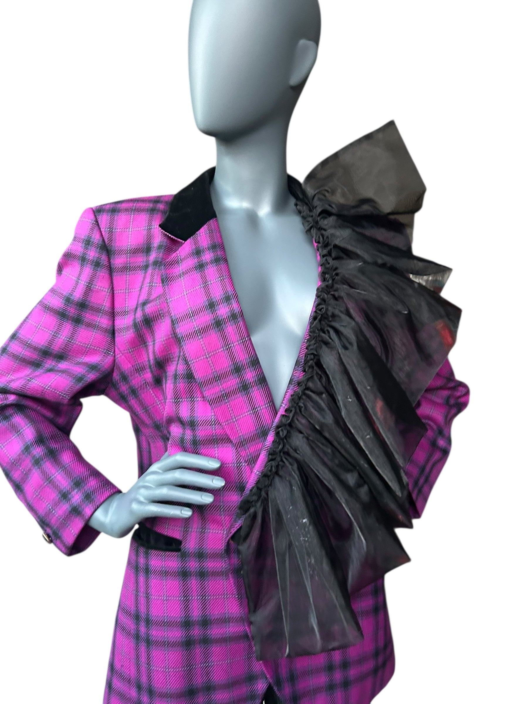 Introducing a complete one-of-a-kind, unique and late 1980s oversized gingham blazer redefined with voluminous organza ruffles and velvet accents by Overdress Vintage Redefined